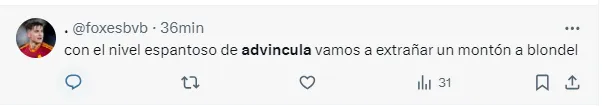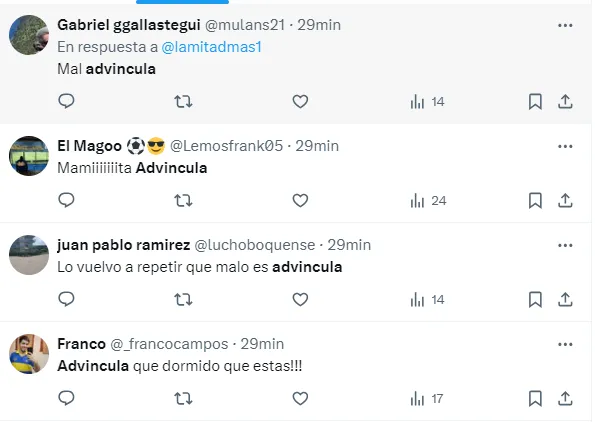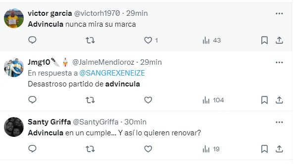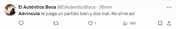 “Advíncula nunca mira su marca”, “Ya está lo de Advíncula en Boca”, “Desastroso partido de Advíncula”, “Advíncula en un cumple… Y así le quieren renovar”, “Advíncula muy mal partido”, fueron algunos de los tantos comentarios de los hinchas criticando el nivel del futbolista.