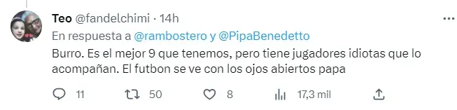 En las últimas horas se revolucionaron las redes luego de que varios simpatizantes descubrieran una cuenta “sospechosa”. Se trata de un usuario que defiende al 9 a capa y espada, pero con algunos detalles que hicieron sospechar a muchos de que fuera el propio jugador autobancándose desde un perfil falso.