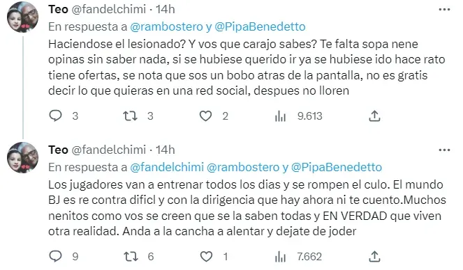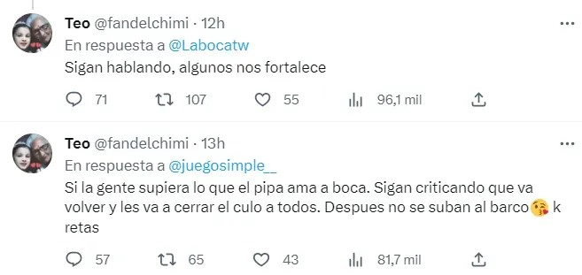 “Tranquilos que él ama a Boca! Dio todo por la camiseta, está donde quiere estar”, “El esfuerzo que hizo Darío por Boca muy pocos lo han hecho”, “Que anti Boca que son. Ojalá la verdad salga a la luz!!!”, son solo algunos de los tuits que el usuario @fandelchimi publicó.