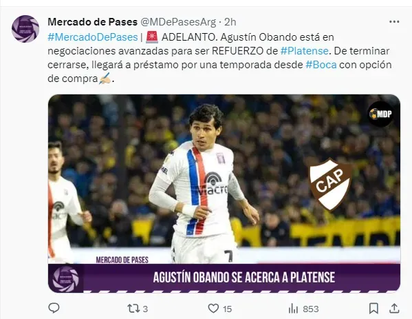 Dentro de estos jugadores que no entrarán en los planes de Martínez, aparece Agustín Obando, a quien ya dirigió en Tigre durante una temporada y media, pero que en esta oportunidad no lo tendrá como variante, y es por eso que el delantero de 23 años está cerca de ser nuevo jugador de Platense.