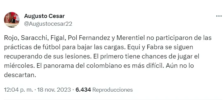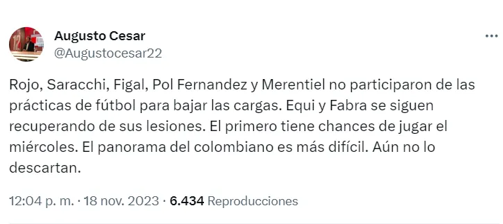 Este sábado, según informó el periodista Augusto César, tampoco estuvieron en la práctica de fútbol Marcos Rojo, Nicolás Figal, Marcelo Saracchi, Pol Fernández y Miguel Merentiel. Estos cinco casos fueron por decisión del cuerpo técnico, que optó por bajarles las cargas. Llegarían tranquilos al duelo del miércoles.
