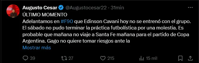 Esta vez, el lesionado es Edinson Cavani, ya que el uruguayo sintió una molestia muscular el pasado sábado y hoy no pudo entrenarse con normalidad. El periodista Augusto César reveló que es poco probable que el capitán xeneize viaje a Santa Fe para el duelo de 32avos de la Copa Argentina debido a que el DT prefiere no arriesgar futbolistas ante la fuerte seguidilla de partidos que tiene su equipo en el inicio de la temporada.