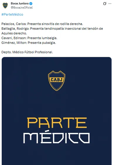 Luego de publicar la lista de convocados, el Xeneize compartió también el parte médico de estos cuatro futbolistas y los motivos por los que no estarán disponibles para el amistoso ante Millonarios.