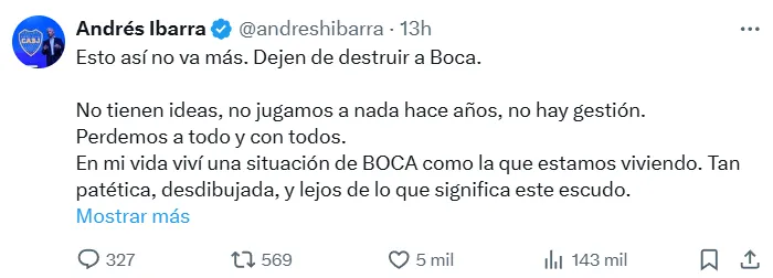 Ibarra definió la actualidad del equipo como “patética, desdibujada, y lejos de lo que significa este escudo”. “Los verdaderos hinchas queremos mucho más, esperamos mucho más, y tenemos la vara bien alta. Se están cagando en los colores más grandes del mundo”, sentenció.