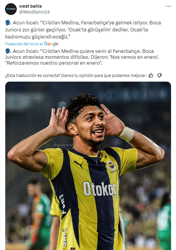 Al respecto, el portal WestBahis de Turquía, alertó que el Fenerbahce retomó las conversaciones e incluso adelantó cuál es la intención del mediocampista xeneize: “Cristian Medina quiere venir al Fenerbahçe. Boca Juniors atraviesa momentos difíciles. Dijeron: ‘Nos vemos en enero’. Reforzaremos nuestro personal en enero”.
