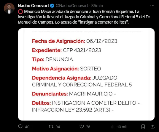 El medio Doble Amarilla explicó que Macri acusó a Riquelme amparado en elartículo 3 de la Ley 23.592 de “actos discriminatorios”, y en paralelo también relacionó la denuncia con la acusación de “instigar a cometer delitos” a la gente. Sobre esto, el candidato a Vicepresidente por la oposición encabezada por Ibarra se explayará este miércoles en una conferencia de prensa que brindará en el Hotel Abasto a las 19 horas.