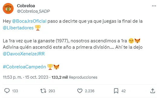 “Hey, Boca, paso a decirte que ya que juegas la final de la Libertadores. La primera vez que la ganaste (1977), nosotros ascendimos a Primera. Adivina quién ascendió este año a primera división…. Ahí te la dejo“, postearon los Loínos a través de su cuenta oficial en Twitter. Otra de las tantas coincidencias que ilusionan al Xeneize para ganar la tan ansiada séptima.