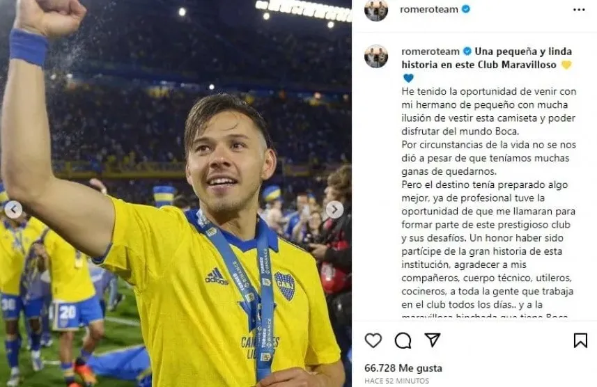 “He tenido la oportunidad de venir con mi hermano de pequeño con mucha ilusión de vestir esta camiseta y poder disfrutar del mundo Boca. Por circunstancias de la vida no se nos dio a pesar de que teníamos muchas ganas de quedarnos. Pero el destino tenía preparado algo mejor”, comenzó la carta que revela que, desde los primeros pasos de sus carreras, los Romero querían vestir la azul y oro.