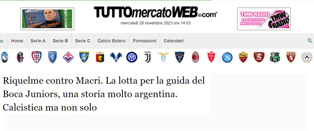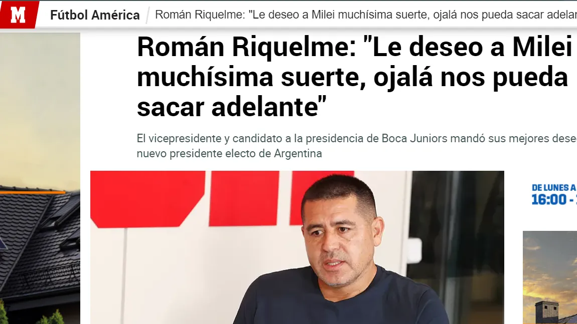 Por ejemplo, el diario Marca, para sumergirse en la puja entre Juan Román Riquelme y Mauricio Macri, hace referencia a las declaraciones del actual vicepresidente xeneize sobre el presidente electo de la nación Javier Milei. Además, explica el apoyo que tendrá el binomio opositor tanto por parte del gobierno que está a punto de asumir en la Argentina como de Martín Palermo.