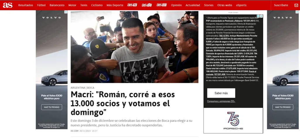 Del mismo modo, Diario AS, replicó las idas y vueltas que se vivieron en Boca durante la jornada del martes 28 de noviembre para desarrollar las causas de la suspensión de las elecciones. En esa misma línea, anexó, con otro artículo, las palabras de Mauricio Macri hacia Juan Román Riquelme respecto al número de socios que cambiaron de categoría adherente a activo, en definitiva, la razón que le generó desconfianza a la oposición y que, acaso, impulsó la presentación de Andrés Ibarra al Juzgado Nacional de Primera Instancia en lo Civil N° 11.