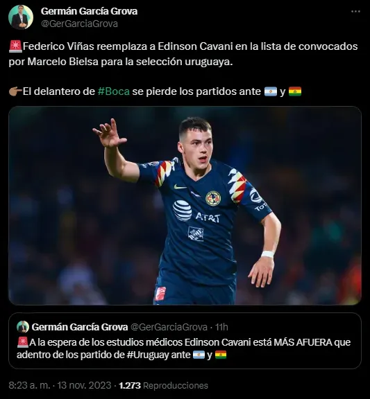 Pese a que muchos en Uruguay reclamaban que era momento de Miguel Merentiel por su enorme presente en Boca, y se intensificó aún más tras la lesión de Cavani, finalmente el Xeneize seguirá contando con “La Bestia” para las semis de la Copa Argentina y en la selección oriental, Marcelo Bielsa optó por inclinarse por Viñas para reemplazar a Edinson Cavani.