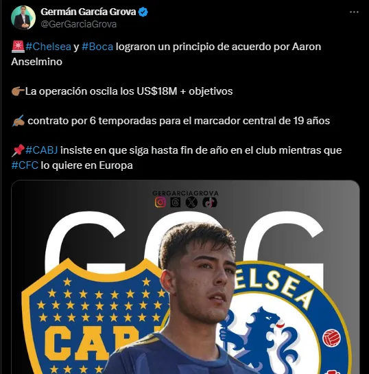 Además, se reveló que Anselmino dio el ok y espera por el acuerdo final entre Boca y Chelsea por el traspaso. La cláusula de rescisión establecida en el contrato que posee en el Xeneize es de 25 millones de dólares, por lo que la oferta del conjunto londinense es inferior a dicho monto (18 millones). Seguirán negociando en las próximas horas, pero la posibilidad de que se concrete su salida en este mercado de pases es concreta.