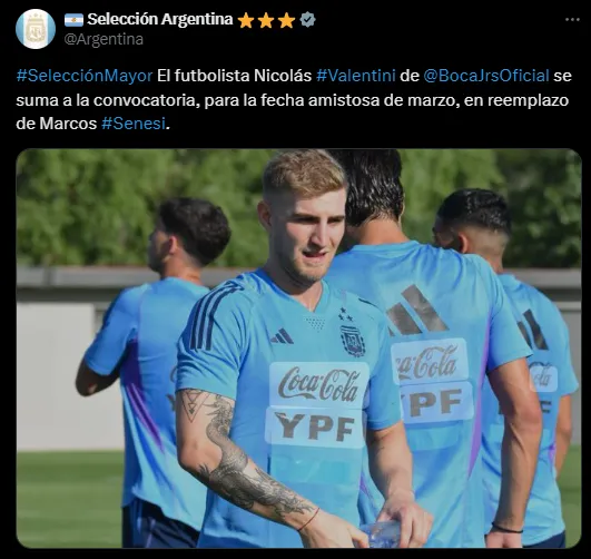 Tras realizarse los estudios, se constató que su lesión le impediría ser parte del seleccionado, por lo que se eligió desafectarlo. En su lugar, en búsqueda de un defensor con similares características -zurdo, alto y con buen pie para la salida-, desde la Selección Argentina confirmaron que su reemplazante será Nicolás Valentini, zaguero de Boca Juniors.