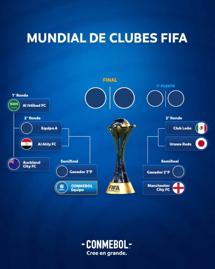 Boca, Palmeiras, Internacional o Fluminense jugarán las semifinales contra Al Ittihad de Arabia Saudita (equipo de Benzema, Kanté y compañía), Al Ahly (Egipto) o Auckland City (Australia). Del otro lado del cuadro aparece el Manchester City, quien se medirá ante el vencedor del cruce entre León (México) y Urawa Reds (Japón).