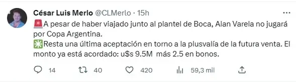 La ilusión de los hinchas del Xeneize era poder despedir en cancha a una de las grandes joyas de la cantera de la institución en el siglo XXI, a sabiendas de su sanción en la Liga Profesional. Sin embargo, tras confirmarse la venta al fútbol portugués, finalmente Alan Varela no jugará por Copa Argentina por pedido expreso del Porto y viajará en las próximas horas rumbo a Europa.