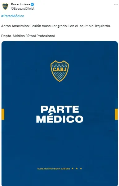 A través de la cuenta oficial, el Departamento Médico de Fútbol Profesional confirmó: “Aaron Anselmino: Lesión muscular grado II en el isquiotibial izquierdo”.