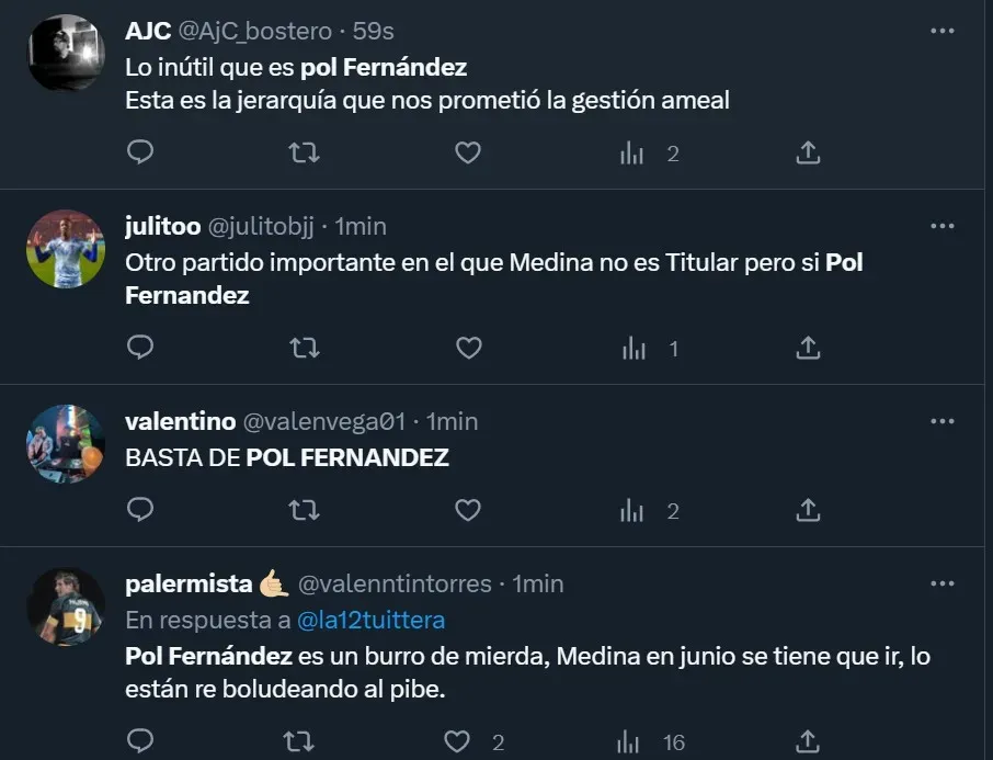 Por medio de Twitter, los fanáticos crucificaron a Pol Fernández, quien no viene teniendo rendimientos sobresalientes y no marca la diferencia, algo por lo que también fue cuestionado Juan Román Riquelme cuando sostuvo que “es el jugador más inteligente del fútbol argentino. Es una estrella, está entre los 2 o 3 mejores del país”.