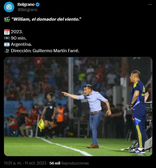 En su cuenta de Twitter, Belgrano se expresó con un chiste en el que postearon una foto de Guillermo Farré, entrenador del Pirata que llegó a los 100 partidos al mando del club ante Boca, y acompañando la imagen, escribieron: “‘William, el domador del viento’. 2023. 90 min. Argentina. Dirección: Guillermo Martín Farré”, publicitado como si fuese el póster de una película.