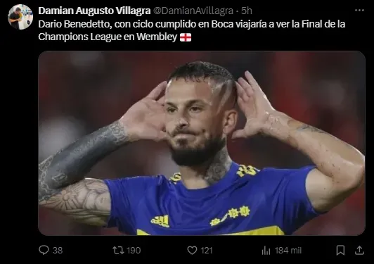 En este contexto, en las últimas horas se instaló una nueva polémica con Benedetto. Es que el periodista de D-Sports, Damián Villagra, reveló en su cuenta de Twitter que el Pipa aprovecharía que no está siendo tenido en cuenta en Boca para viajar este fin de semana a Londres para ver la final de la UEFA Champions League en Wembley, partido en el que se enfrentarán Real Madrid y Borussia Dortmund.