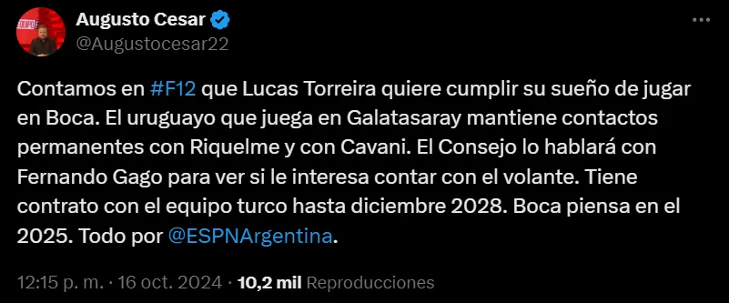En sus últimas declaraciones al respecto, Torreira señaló: “Tengo claro que Galatasaray va a ser mi último club en Europa y quiero ir a Boca no de muy grande porque miro mucho el fútbol argentino y las redes sociales y no es un fútbol fácil. Boca es muy grande y todo el mundo está pendiente del club, por lo que todo el tiempo tenés que estar de la mejor manera”.