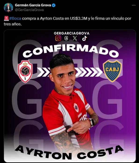 El Xeneize sigue con la lógica de incorporar seis o hasta siete refuerzos en este mercado para darle un salto de jerarquía y recambio al plantel actual y adoldarlo a las pretensiones de Fernando Gago. Carlos Palacios fue el primero y Ayrton Costa el segundo.
