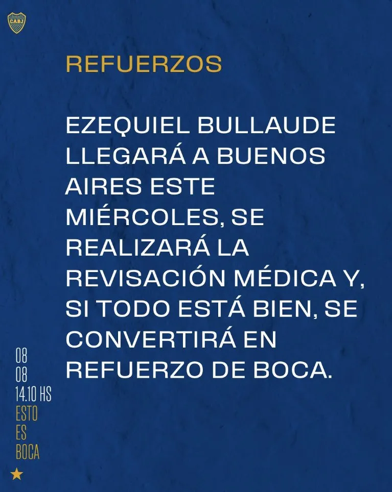 A la espera de la definición de la serie con Nacional, Boca confirmó a su quinto refuerzo. A través de su nueva cuenta “Esto es Boca”, el club de la Ribera comunicó que Ezequiel Bullaude se hará la revisión médica este miércoles para sumarse al plantel del día después del partido que se jugará en La Bombonera.
