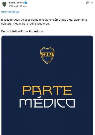 Es que este lunes se confirmó la gravedad de la lesión de Alan Velasco tras los estudios realizados. A través de un parte médico, Boca informó que “sufrió una distensión grado 2 del ligamento colateral medial de la rodilla izquierda”.