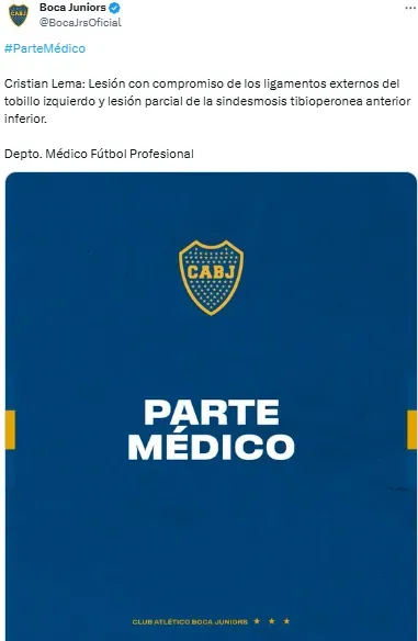 Mientras todo el plantel tuvo el día libre este lunes, el defensor se hizo presente en el Centro Médico Genea, donde Boca envía a sus jugadores a realizarse estudios y chequeos. Para Lema, los resultados no fueron nada positivos. El club de la Ribera informó, mediante un parte médico, que el defensor sufrió una “lesión con compromiso de los ligamentos externos del tobillo izquierdo y lesión parcial de la sindesmosis tibioperonea anterior inferior”.