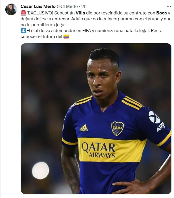 La primera carta la jugó el cafetero: durante este jueves se hizo pública la notificación a Boca a través de una carta documento en la que Villa dice considerarse como jugador libre, ya que no fue reincorporado al plantel que dirige Jorge Almirón. “Adujo que no lo reincorporaron con el grupo y que no le permitieron jugar”, contó el periodista César Luis Merlo sobre el caso.