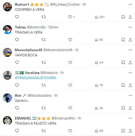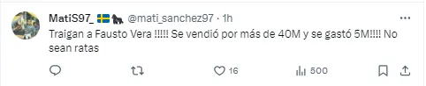 El pedido fue claro: “Traigan a Fausto Vera”. Otra de las réplicas que se leyeron en X vino con mucha más bronca: “Traigan a Fausto Vera! Se vendió por más de 40M y se gastó 5M! No sean ratas”.