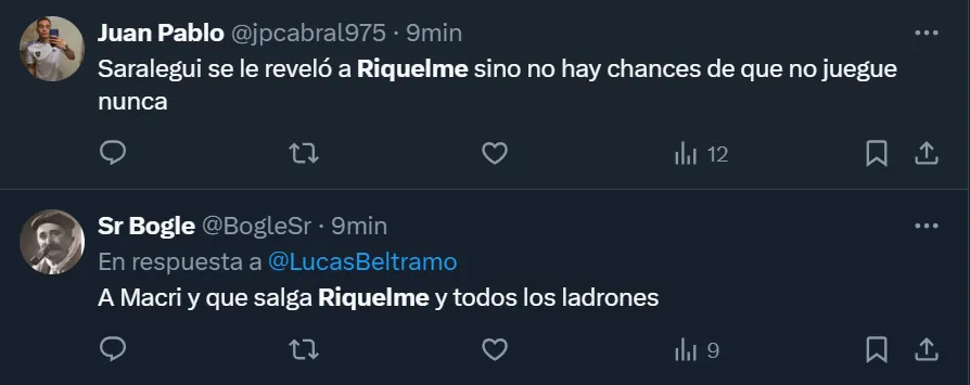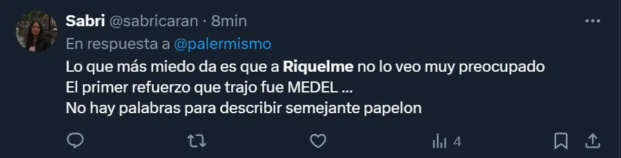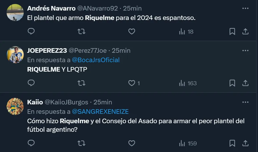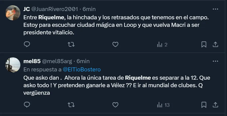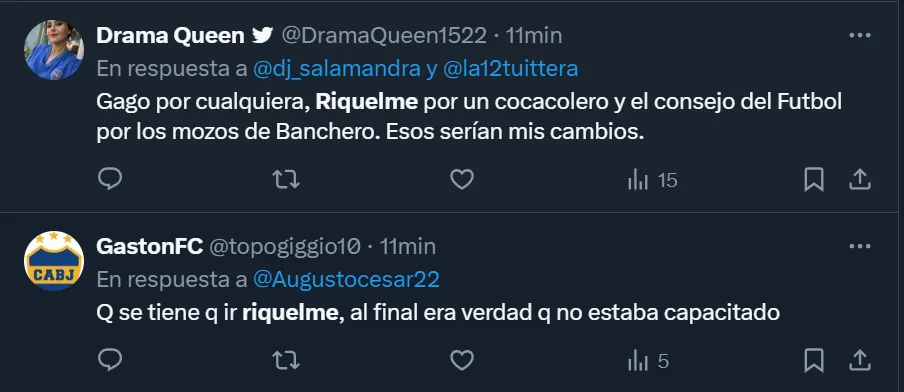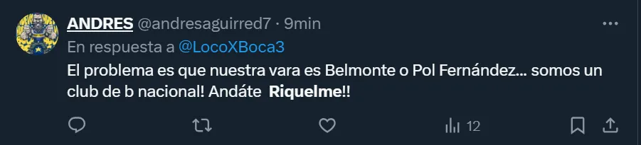 Así como se mostraron enojados por cómo se dio el encuentro frente a los del Bajo Flores, a través de Twitter varios simpatizantes hicieron notoria su disconformidad con la actualidad de la gestión riquelmista, y llegaron a pedir por su salida. “El problema es que nuestra vara es Belmonte o Pol Fernández. Somos un club de B Nacional. Andate Riquelme“, expresó el usuario @LocoXBoca3.