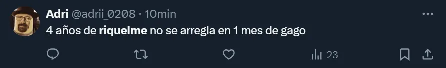 Otro de los hinchas, como fue el caso de @adrii_0208 sostuvo que “4 años de Riquelme no se arregla en 1 mes de Gago“, mientras que @topogiggio10 exclamó que “se tiene que ir Riquelme. Al final era verdad que no estaba capacitado”. Incluso, cuando finalizó el partido, en La Bombonera arremetieron contra el plantel: “Jugadores no rompan las pelotas, a ver si se dan cuenta que están jugando en Boca“, se pudo escuchar desde los cuatro costados del estadio.