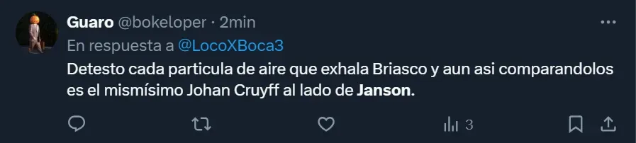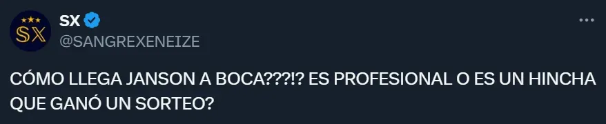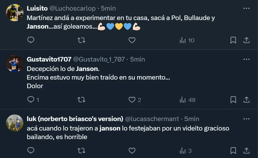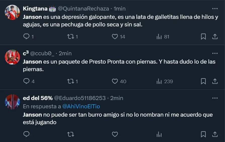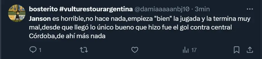 Por medio de las redes sociales, pudieron observarse comentarios similares al que @QuintanaRechaza realizó en X, la ex Twitter: “Janson es una depresión galopante, es una lata de galletitas llena de hilos y agujas, es una pechuga de pollo seca y sin sal”. Así como sostuvieron que el ariete de 29 años nacido en Olavarría no gravita ni genera peligro en el arco rival, destacaron que tampoco colabora defensivamente a la hora de la presión y la recuperación.