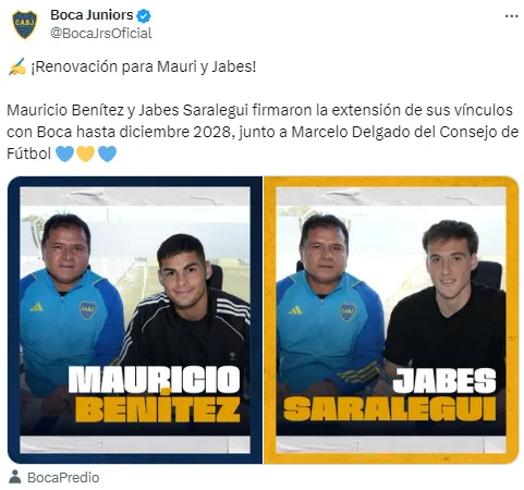 A través de las redes sociales del club, la dirigencia del Xeneize oficializó la extensión de los vínculos de Jabes Saralegui y Mauricio Benítez. Los mediocampistas juveniles se destaparon con grandes presencias en este 2024 y continuarán ligados al equipo.