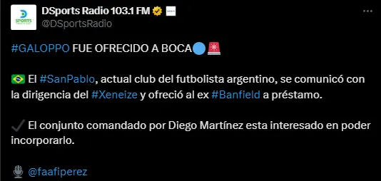 Giuliano Galoppo fue ofrecido para arribar al Xeneize a modo de préstamo. En Sao Paulo no pretenderían desprenderse de él debido a que supo ser una pieza importante para el plantel, pero su grave lesión lo dejó fuera de las canchas por casi un año entero. Ahora se encuentra regresando poco a poco al juego y por eso, no descartan que pueda tener más rodaje en otro club.