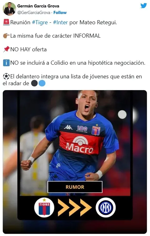 El primer acercamiento fue con el Inter de Milán, asegura el periodista Germán García Grova. “Reunión de carácter informal. El delantero integra una lista de jóvenes que están en el radar del Inter”, explicó el de TyC Sports a través de su cuenta de Twitter. En la junta no hubo una oferta sobre la mesa, pero la misma parecer ser inminente si las charlas van por buen rumbo.