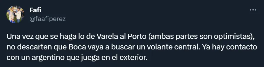 A lo largo de las últimas horas, fue el periodista Facundo Pérez, de D-Sports Radio, quien confirmó que “una vez que se haga lo de Varela al Porto (ambas partes son optimistas), no descarten que Boca vaya a buscar un volante central”. Lógicamente, los hinchas comenzaron a preguntarse quién podría llegar a ser el indicado.