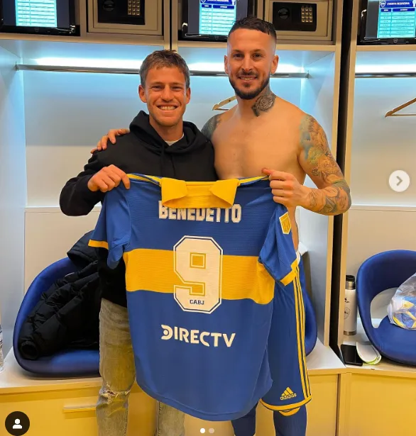 Las imágenes de ese momento de intimidad las compartió poco después en su cuenta de Instagram. Hubo pizzas y foto con Cristian Medina, Alan Varela y Valentín Barco. Además, se llevó de regalo la camiseta de Darío Benedetto, quien volvió a sumar minutos tras su lesión.