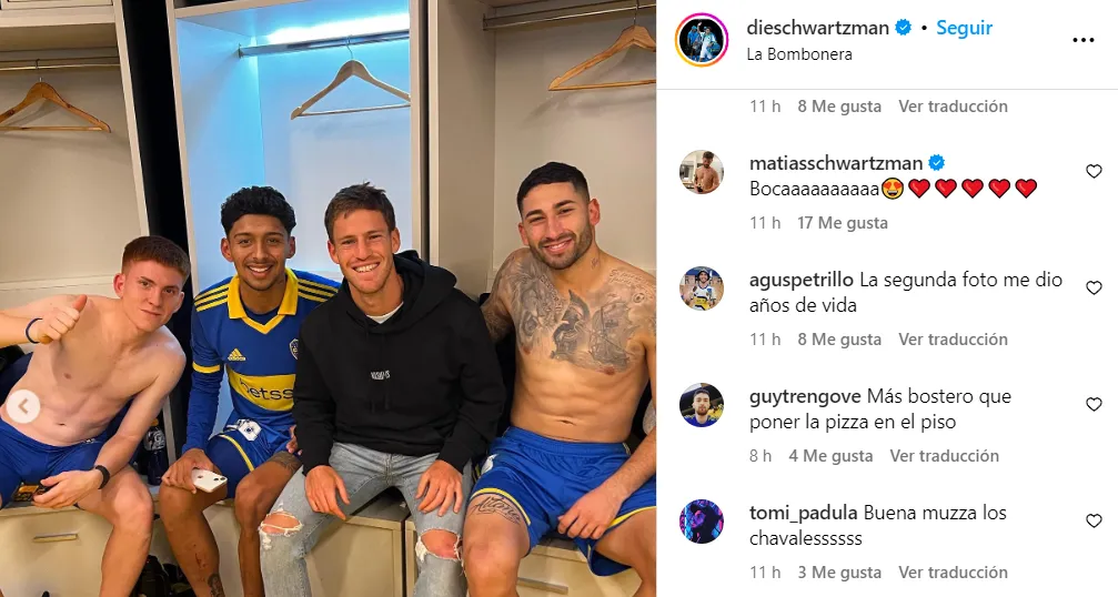 Finalizado el encuentro y favorecido por el buen semblante que dejó el triunfo, el plantel recibió poco después una visita sorpresa en el vestuario. Tras su participación en Wimbledon, el tenista Diego Schwartzman, quien es además un fanático hincha Xeneize, quiso pasar a saludar.