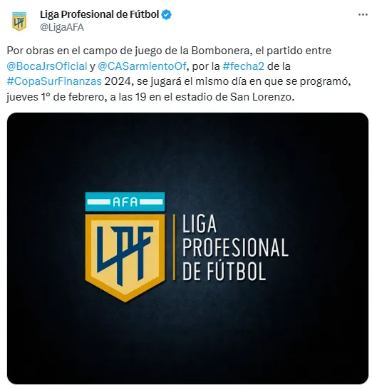 “Por obras en el campo de juego de la Bombonera, el partido entre Sarmiento y Boca, por la #fecha2 de la Copa Sur Finanzas 2024, se jugará el mismo día en que se programó, jueves 1° de febrero, a las 19 en el estadio de San Lorenzo”, comunicó la Liga Profesional a través de sus canales oficiales.