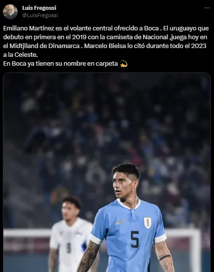 Llamado de igual manera que el Dibu, el volante central uruguayo de 24 años fue ofrecido en las últimas horas en el club de Ribera y, lejos de desestimarlo, el periodista Luis Fregossi informó que en Boca guardaron su nombre para tenerlo como una alternativa en la posición.