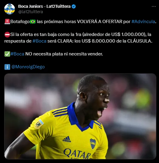 Sin embargo, Botafogo no se da por vencido respecto a la contratación de Advíncula, por lo que nuevamente enviarán una oferta por su pase en las próximas horas. El periodista Diego Monroig informó que en Boca no tienen la necesidad de vender al peruano o de conseguir un ingreso extra de dinero en este mercado, y que Advíncula se iría del club solo si la oferta es la que realmente pretenden en el Xeneize por su pase.