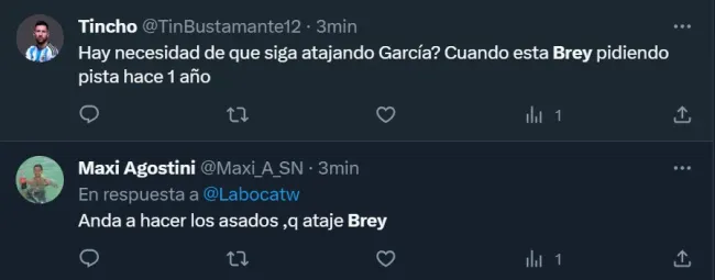 La derrota del Xeneize en Córdoba contra Belgrano generó un enorme malestar entre los hinchas, que a través de las redes sociales hicieron tendencia a Brey, y solicitaron que forme parte del equipo titular durante la ausencia del mundialista en Sudáfrica 2010 y Brasil 2014. Claro, para la tribuna no fue buena la actuación de Javier García bajo los tres palos.