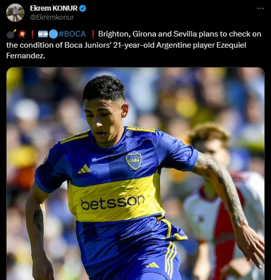 El jornalista especializado en mercado de pases informó que el Brighton planea pedir condiciones a Boca por Equi Fernández y comprobar si es posible efectuar un traspaso en este mercado de pases. Para el entrenador Diego Martínez, el ex Tigre será su volante central titular, por lo que es poco factible que se dé su salida inminente. Sin embargo, que Equi esté en el radar de Brighton hace que Boca deba estar atento a que también puede llevarse a otra figura en el corto plazo para juntar con el Colo Barco. Además, el conjunto inglés no es el único interesado en el volante xeneize.