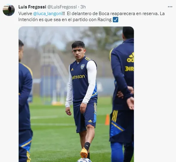 Según lo informado por el periodista Luis Fregossi, Luca Langoni sumará minutos con la Reserva de Mariano Herrón el próximo sábado 14 de octubre, y la idea es que previo la final contra Fluminense, ingrese en algunos partidos del primer equipo, para llegar con ritmo futbolístico.