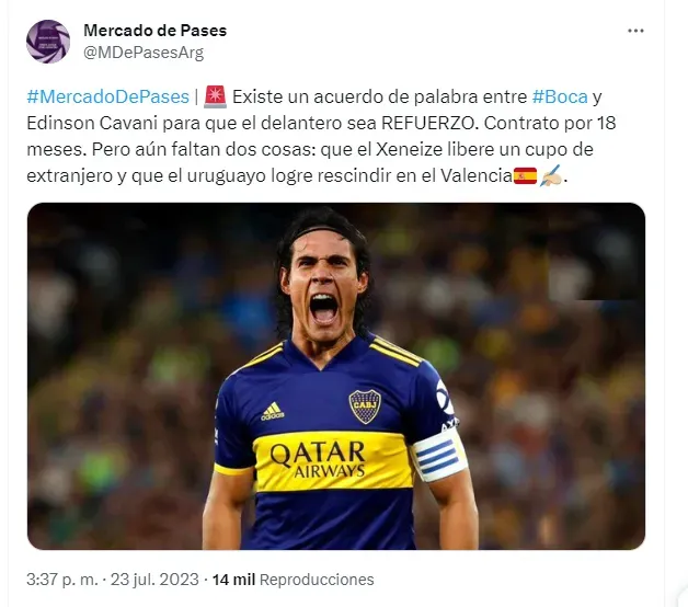 Acorde a lo que informa el medio Mercado de Pases, existe un acuerdo de palabra entre Boca y Edinson Cavani para que el delantero de 36 años sea refuerzo del club. Para esto, el Xeneize debe liberar un cupo de extranjero, mientras que el uruguayo debe rescindir su contrato con Valencia.
