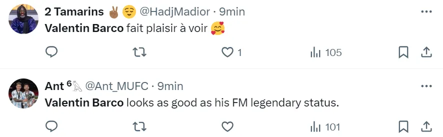Incluso, el nacido en Veinticinco de Mayo recibió elogios en francés: ‘‘Encantado de ver a Valentín Barco”. Para completar, lo ven con potencial para convertirse en una de las grandes figuras del fútbol mundial: ”Valentín Barco puede convertirse en una leyenda”.