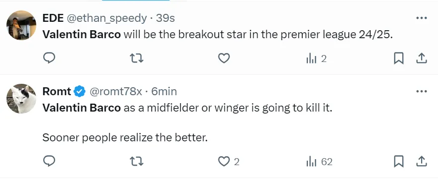”Valentín Barco será una de las estrellas de la Premier League en la temporada 2024/2025”, escribió uno de los aficionados británicos en redes sociales. En esa misma línea, otro simpatizante de las Gaviotas comentó: ”Barco como mediocampista o extremo es letal. Cuanto antes se den cuenta mejor”.