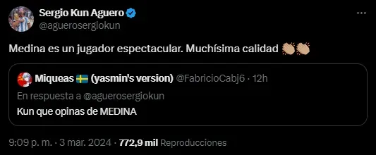 Sin embargo, el charrúa no fue el único en llevarse elogiosas palabras de parte del ex Manchester City, sino que el Kun también se rindió ante los pies de Cristian Medina. Autor del gol del Superclásico, y determinante para el juego de Boca desde su regreso tras el Preolímpico con la Selección Argentina sub 23, el volante fue nuevamente una de las figuras del partido ante Belgrano, y por eso se ganó un mensaje de Agüero.