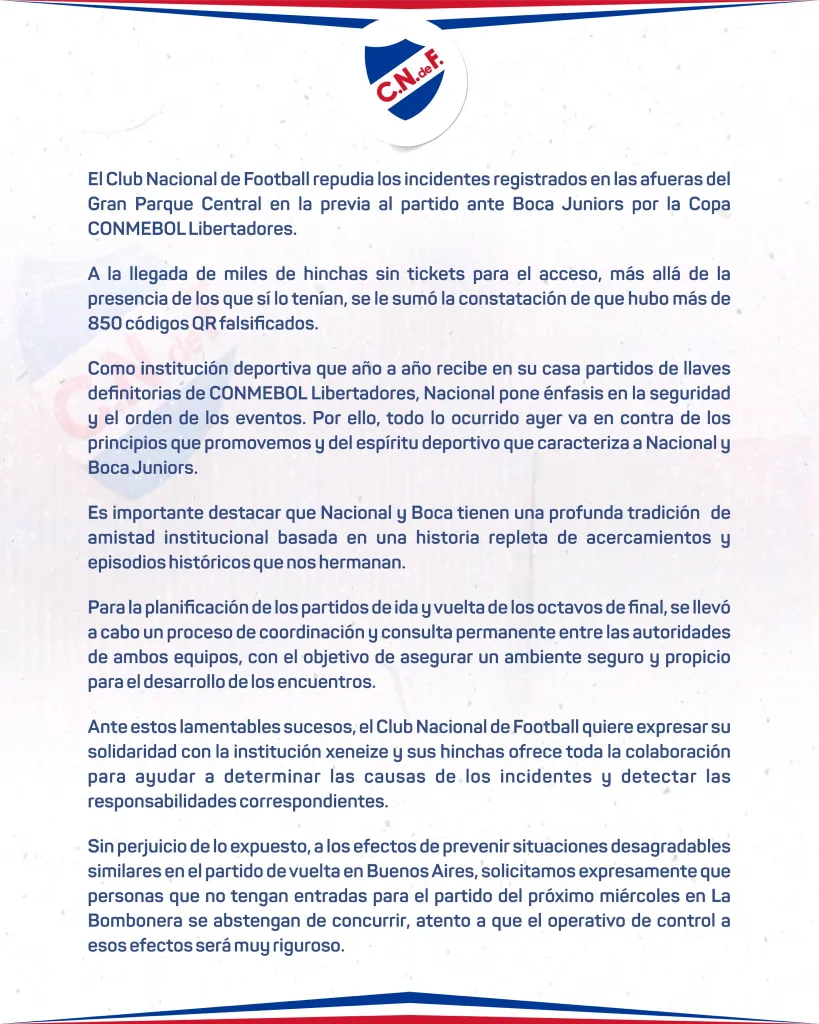 Para cerrar, Nacional le pidió a sus hinchas que no concurran a La Bombonera sin entradas, ya que “el operativo de control a esos efectos será muy riguroso”.